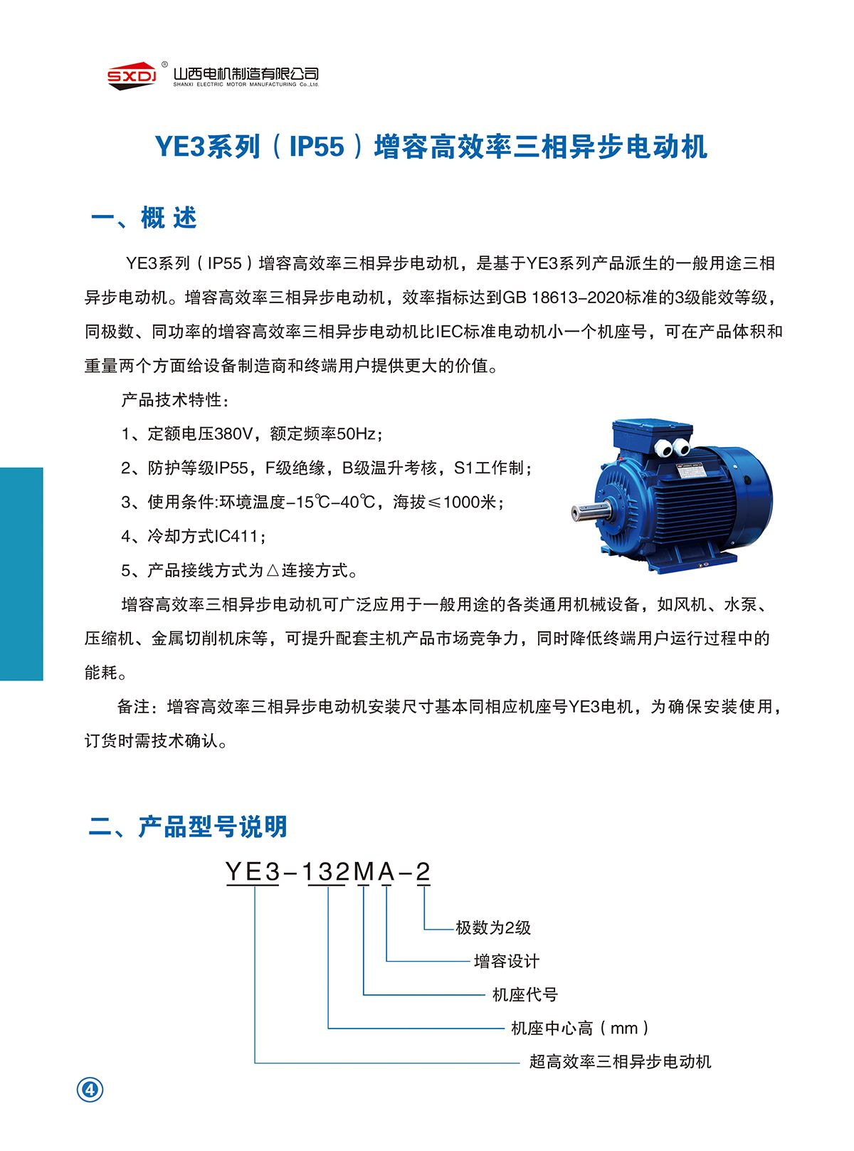 封閉式自扇冷卻籠型轉(zhuǎn)子高效三相異步電動機,設(shè)計符合IEC、GB等相關(guān)標(biāo)準(zhǔn)要求。YE3系列(IP55)增容高效率三相異步電動機,效率指標(biāo)達(dá)到GB18613-2020《電動機能效限定值及能效等級》中3級能效水平。